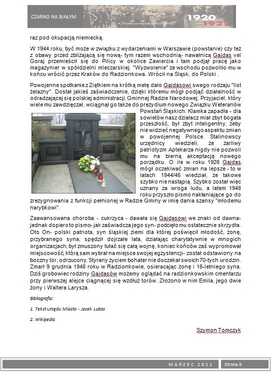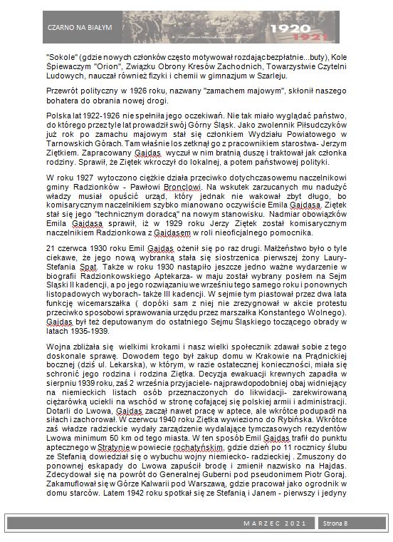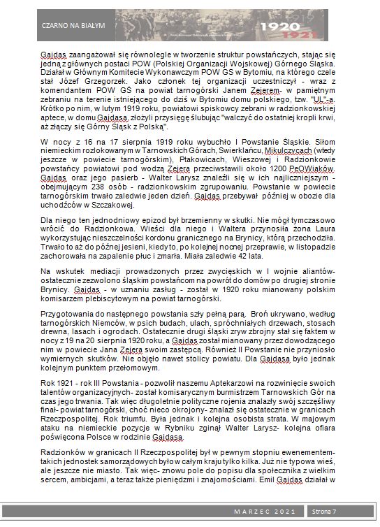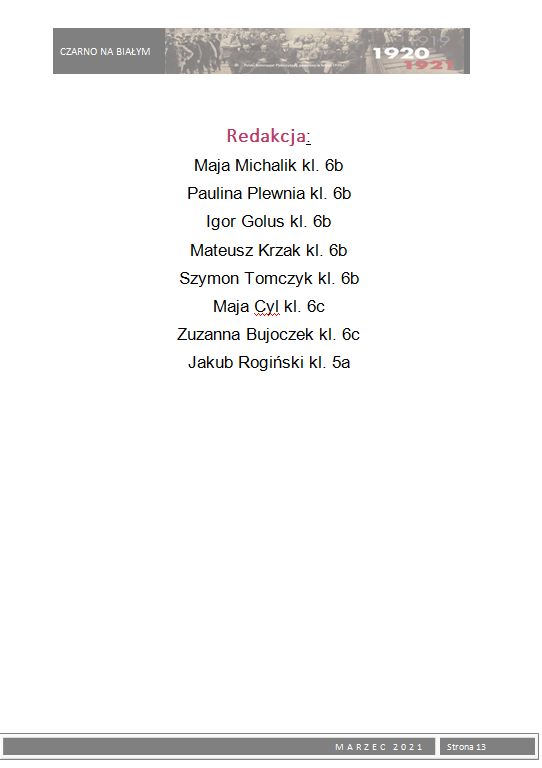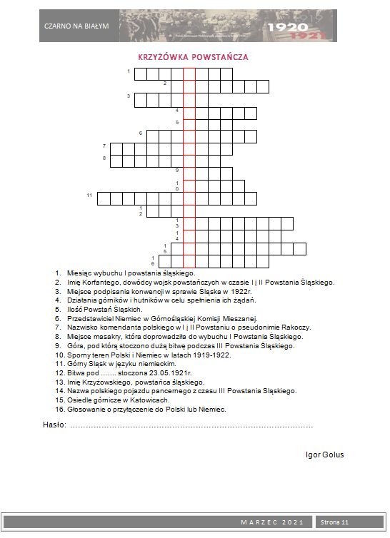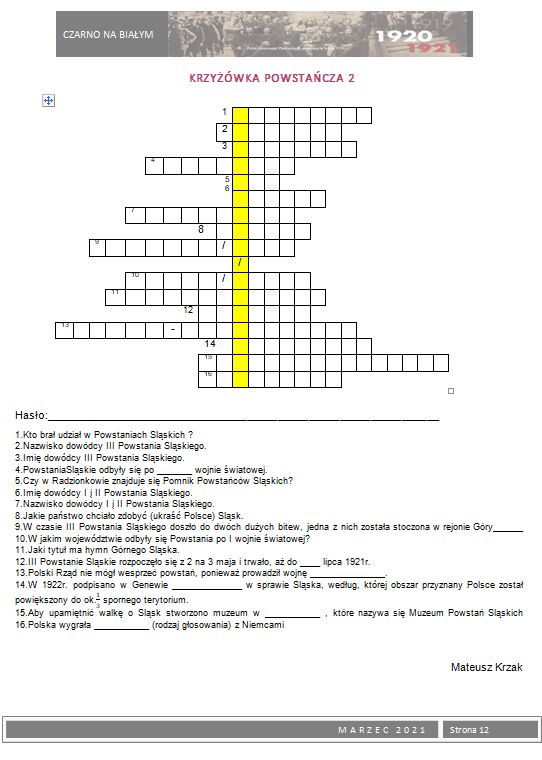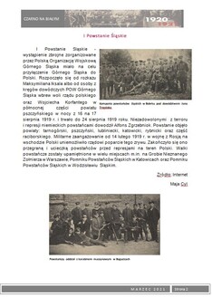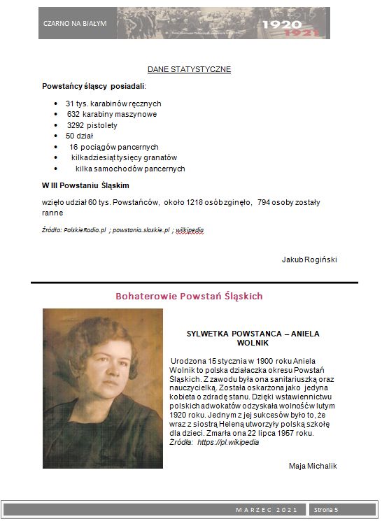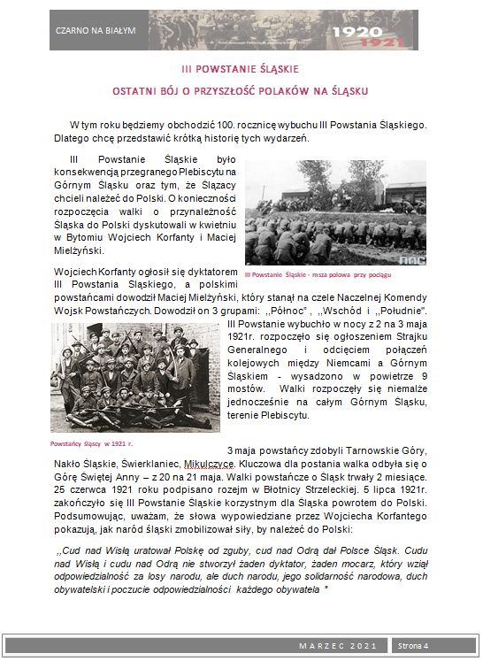 W ramach 100. rocznicy Powstań Ślaskich wydaliśmy okolicznościową gazetkę szkolną Czarno na białym z tematyką powstańczą. Młodzież przygotowała szereg artykułów poświęconych powstaniom oraz bohaterom wydarzeń z lat 1919 – 1921. Zainteresowani uczniowie mogli nie tylko zapoznać się z istotnymi faktami historycznymi dotyczącymi powstań i plebiscytu, ale również poznać wiele ciekawostek i postaci związanych bezpośrednio z naszym miastem, które brały czynny udział w tych wydarzeniach